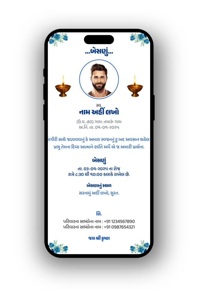 Create beautiful Besnu & Shradhanjali cards online for free with traditional Gujarati designs.